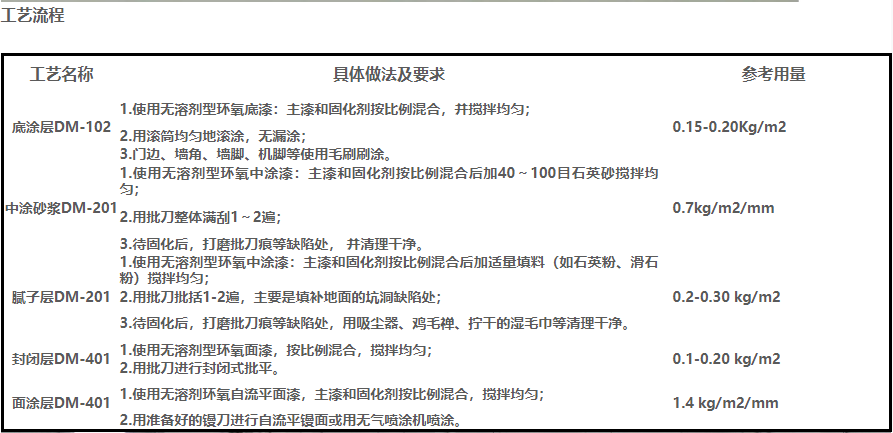 所使用材料: 迪美瑞環(huán)氧樹脂滲透封閉性底漆,環(huán)氧樹脂中途,環(huán)氧樹脂面漆,石英砂,膩子粉